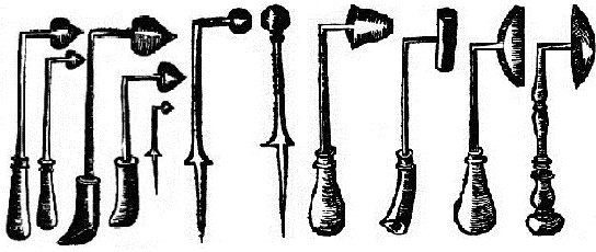 ![]() Olive Cauteries - (l to r): Paré (1649), Pierre Dionis (1740), Jacques Guillemeau (1597), Johannes Scultetes (1666) and G. Gedney Godwin |