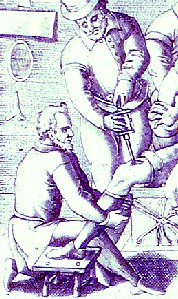 Not everyone was a fan of the device. When describing the terebellum, German surgeon Matthias Gottfried Purmann says he had one when he started his surgical career "which I used to carry with me at my first going into the [military] Camp, but to no purpose, for it is impossible with that Instrument to take hold of any Bullet that lies in the Body."4 Purmann instead recommended his readers use bullet forceps because, as mentioned previously, they "are the most convenient Instruments that can be used for extracting Bullets out of Wounds."5 Although no one mentions it, screwing even the sharpest pointed end of a metal tool into a bullet lodged against a bone seems like an incredibly painful prospect. Even so, there are a variety of images of surgeons using terebellums to extract bullets.